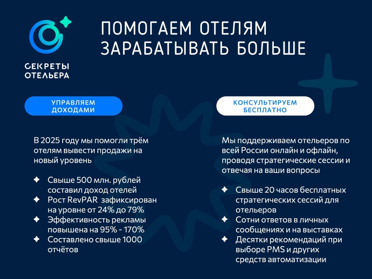 Подводя итоги уходящего года, сегодня обратим внимание не на выставки, а на то, что каждый день позволяет нам получать новый опыт и делиться им с коллегами. Мы предоставляем отелям услуги управления доходами "под ключ", строя работу на принципе качества, а не количества. Наша цель — уделять максимум внимания партнёрам, которых мы выбираем, и сопровождать их бизнес с вдумчивым подходом. Мы воспринимаем успех отелей наших партнёров как свой собственный и вкладываем значительные усилия в повышение их продаж. Вместе с этим, мы стремимся быть полезными для всех, кому интересен наш опыт и профессиональное мнение. Мы активно идём на контакт — организуем выставки, общаемся с вами онлайн и регулярно проводим бесплатные стратегические сессии, где охотно консультируем вас по самым разнообразным вопросам. Сегодня мы не будем вдаваться в детали и сложные цифры. Мы хотим подчеркнуть самое важное: наша работа направлена на ваш успех, и мы выполняем её честно и с максимальной эффективностью.