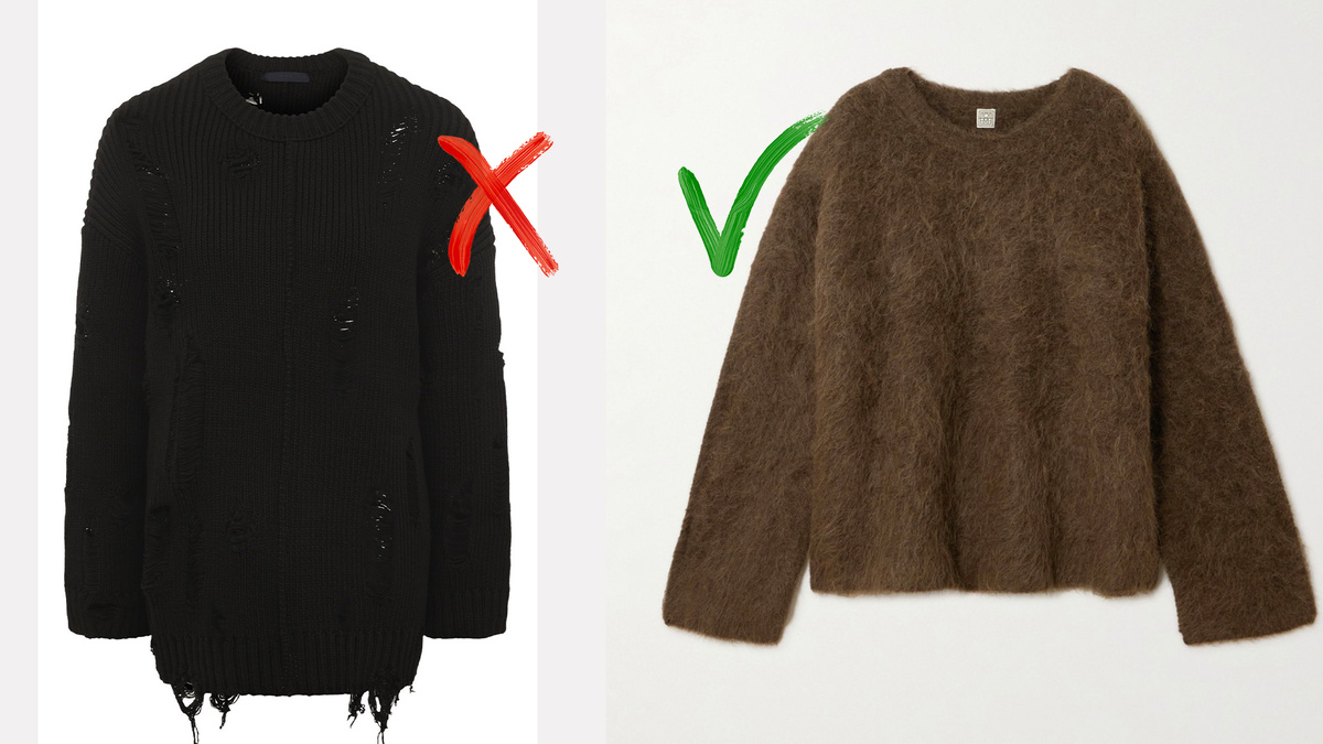 С нарочитыми дырочками и потертостями. Рынок ими перенасытился, и сейчас они уже не выглядят свежо. Поэтому, к сожалению, такой свитер не сделает ваш образ супермодным.