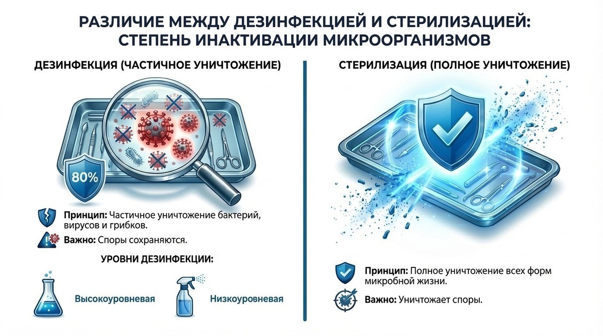 Вы приходите к стоматологу или косметологу, видите, как врач достает инструмент из пакета, и успокаиваетесь. Но задумывались ли вы, что происходит с этими щипцами и скальпелями ДО того, как они попали в крафт-пакет? Сегодня мы разберем всю физику и химию процесса: от грязного лотка до абсолютной стерильности. Многие путают дезинфекцию со стерилизацией. Давайте раз и навсегда проведем черту. Важно: стерилизация не заменяет дезинфекцию! Это финальный аккорд. Чтобы инструмент стал безопасным, он должен пройти жесткий маршрут из трех этапов. Самый грязный и важный этап. Представьте инструмент после операции: на нем кровь, частицы жира, лекарства. Если сразу засунуть это в стерилизатор, грязь просто пригорит к металлу, а под этой коркой выживут микробы. Поэтому сначала — мойка. Вручную щетками или, что гораздо надежнее, в ультразвуковых ваннах. На этом этапе убирают всю видимую и невидимую органику. Здесь мы добиваем то, что не смыла вода. В зависимости от опасности инструмента, дезинфекция
