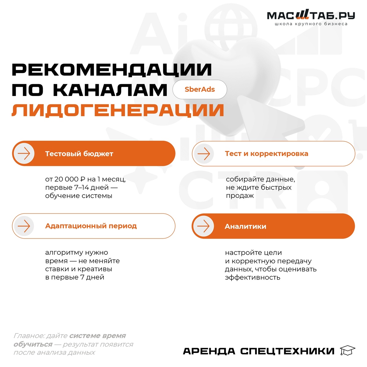 SberAds относительно новый и "не известный" канал для отрасли аренды строительной техники и оборудования. В 2025 году Маркетологи нашей отрасли стали активно его использовать для привлечения заявок. По-началу, трафик был не большой и "дорогой". Сейчас, при грамотном построении рекламной Компании, стоимость лида подходит к 1 500,00 руб., что бьется среди конкурентов. Заявки, как правило, носят длительный характер аренды, заявки поступают от ""прямых Заказчиков. Данный канал эффективен, однако, требуется следовать следующим рекомендациям, на основе опыта, уже "освоивших" данных канал маркетологов и владельцев Компаний по аренде строительной техники и оборудования: 1. Фактор, влияющий на высокий качественный траффик: Бюджет и время на обучение. Инструменты для работы: Выделите тестовый бюджет на 1 месяц (от 20 000,00 руб.) на период формирования ЦА и обучения системы работы с Вашими триггерами по поиску прямых Заказчиков. Комментарии от экспертов школы: Это не пустые слова. Выделите о