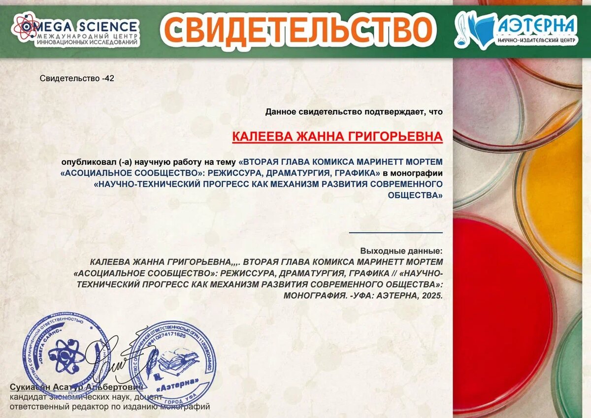 Калеева ЖГ. Вторая глава комикса Маринетт Мортем "Асоциальное сообщество": режиссура, драматургия, графика // Научно-технический прогресс как механизм развития современного общества: монография. выпуск 104 [под ред. А. А. Сукиасян]. - Уфа: Аэтерна, 2025. С. 251-271. https://aeterna-ufa.ru/sbornik/KM-104.pdf