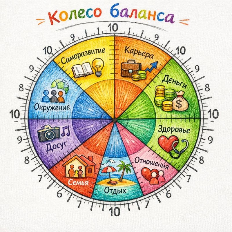 Особенно — перед Новым годом?! Представьте колесо, которое катится по дороге жизни. Когда оно хорошо едет? Когда оно круглое. В теории всё просто. В реальности — наша жизнь почти никогда не находится в идеальном балансе. Она зависит от людей, обстоятельств, неожиданных поворотов, решений (и их отсутствия — да, это тоже выбор). Но вот важный момент: мы не можем контролировать всё, зато можем осознанно стремиться к балансу. И именно здесь начинает работать колесо жизненного баланса. Когда вы честно смотрите на сферы своей жизни, становится видно: ❓где энергия утекает, ❓где вы давно «едете на ободе», а где всё держится только на привычке. Раньше я думала так: «Вот появятся деньги — и в семье станет спокойнее, и здоровье подтянется, и карьера пойдёт вверх. Ведь настроение же будет хорошее». Отчасти логично. Но в моей жизни колесо закрутилось не с денег. Оно закрутилось с дела, которое я люблю. Когда я занимаюсь тем, что по-настоящему моё: появляется энергия, из энергии рождаются деньги,
