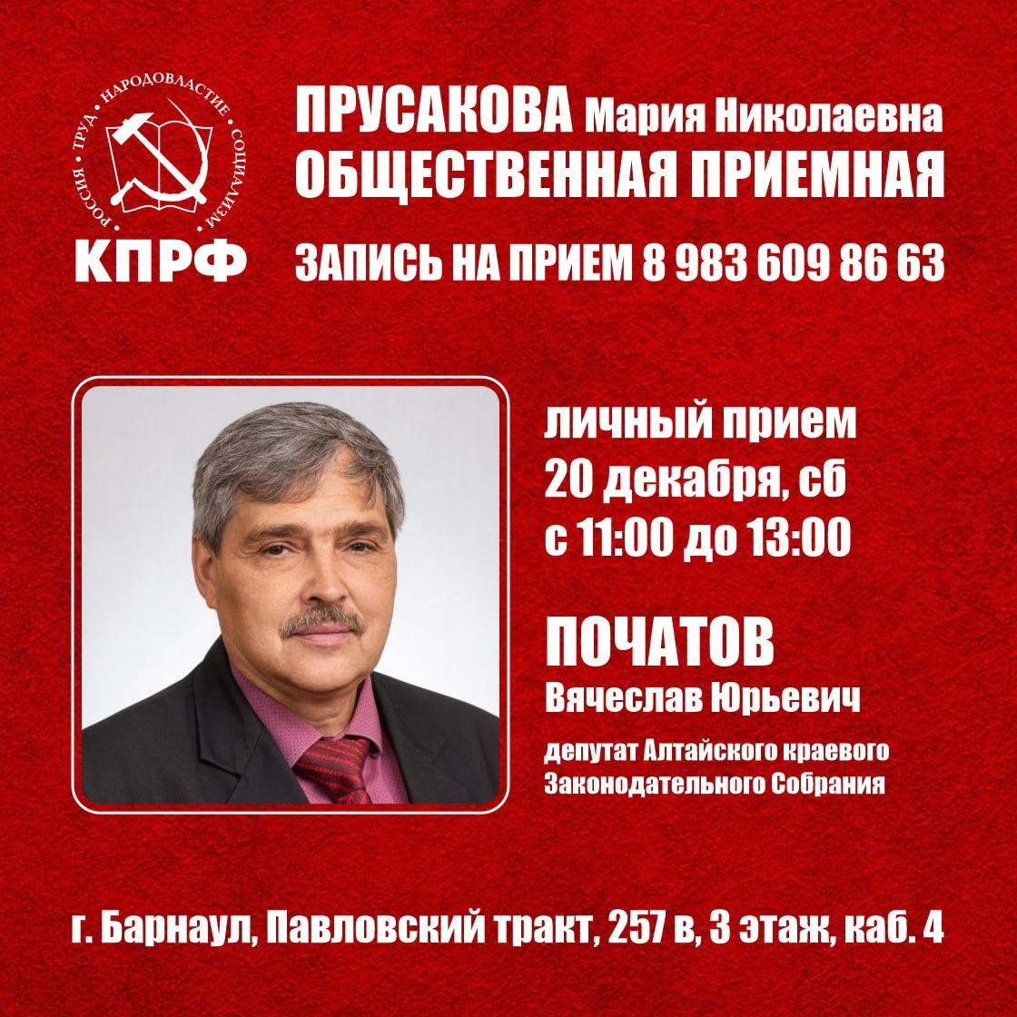 : г. Барнаул, Павловский тракт, 257в, 3 этаж, каб. 4. 📌20 декабря, сб, 11:00–13:00, ПОЧАТОВ В.Ю., депутат АКЗС ☎️ Предварительная запись по тел. +7-983-609-86-63