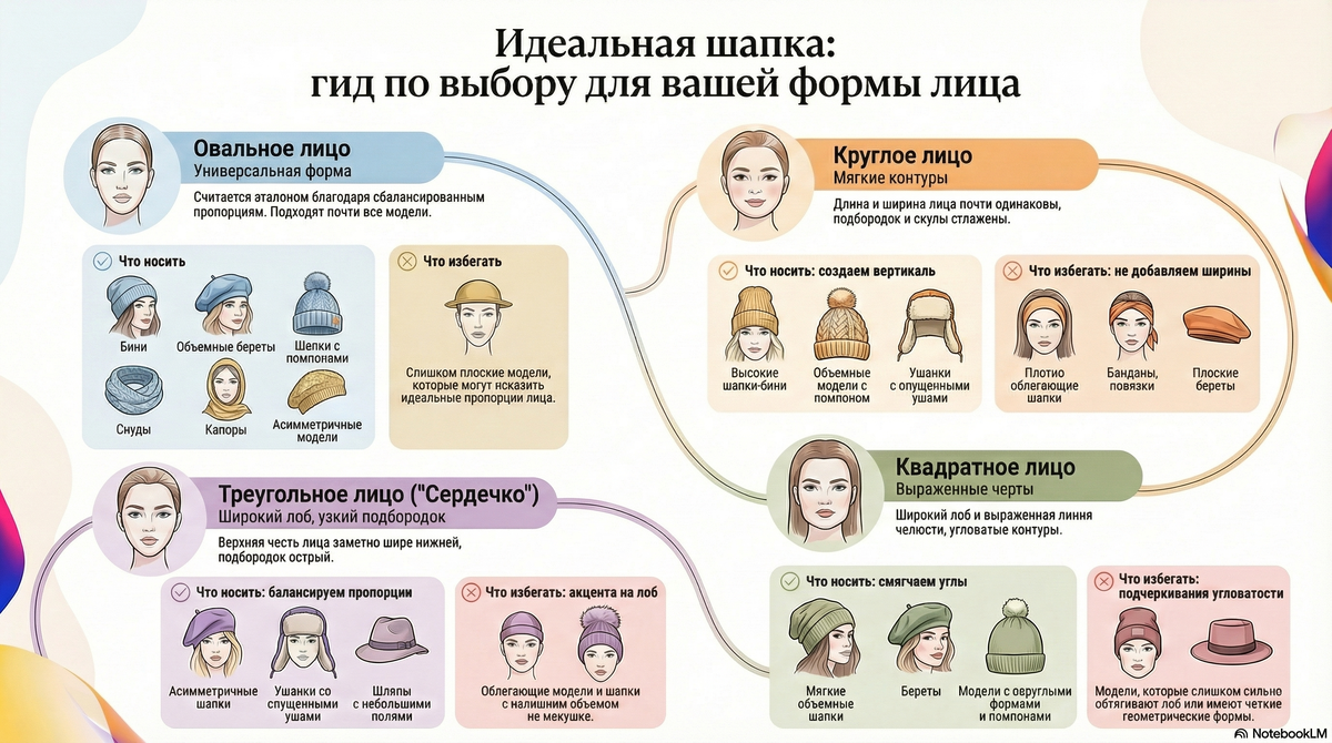 Как узнать свою форму лица? Прежде чем выбрать модель для вязания, определите форму своего лица — это совсем несложно. Уберите волосы назад и внимательно посмотрите на себя в зеркало. Можно также воспользоваться фотографией, но важно, чтобы она была сделана камерой на уровне глаз, а не фронтальной камерой телефона, чтобы избежать искажения пропорций. Обратите внимание на соотношение длины и ширины лица, а также на очертания лба, скул и подбородка. Чаще всего выделяют овальную, круглую, квадратную и треугольную формы лица. Не беспокойтесь, если ваше лицо не полностью соответствует какому-либо из этих типов — это абсолютно нормально. Просто выберите описание, наиболее близкое к вашему.