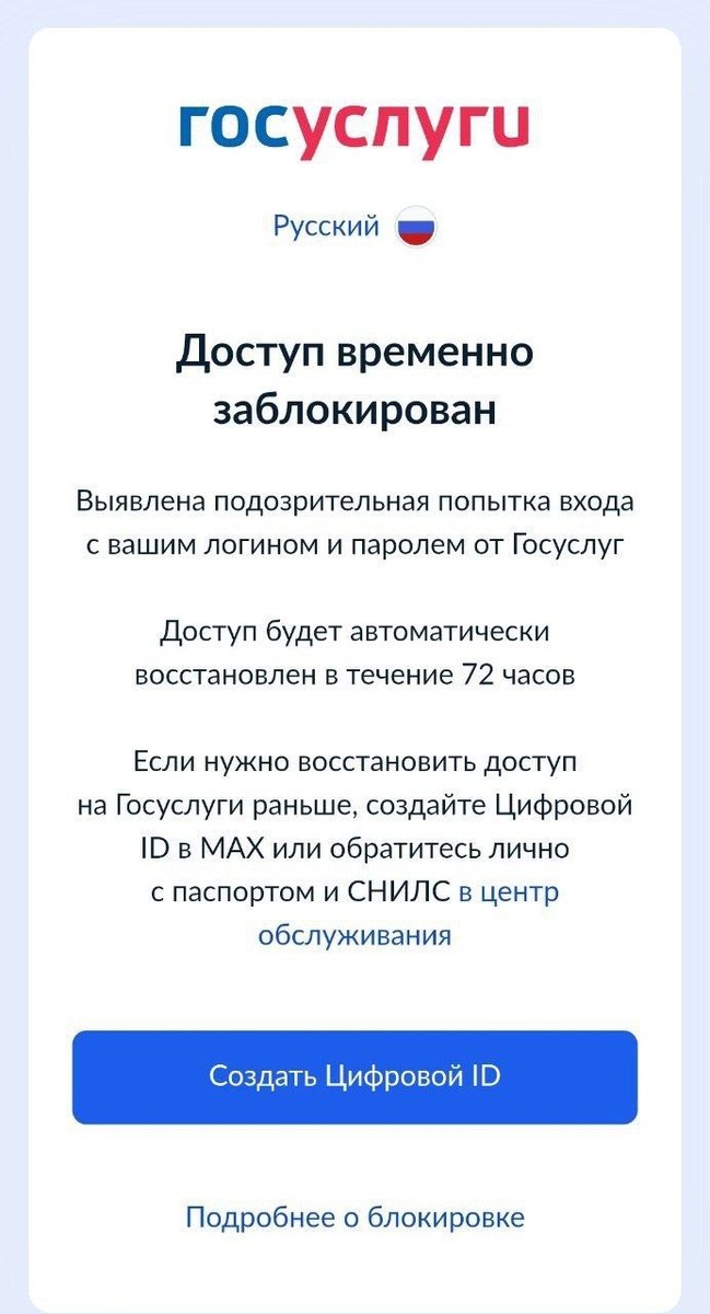 ! Чтобы разблокировать доступ придётся подождать 72 часа, сходить в МФЦ или ... подтвердить личность через супермессенджер MAX. Самое забавное: последние несколько дней пользователи жалуются на участившиеся блокировки. А ловко они это придумали!