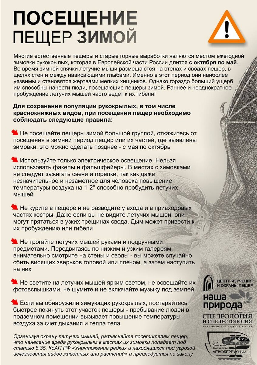 Центр изучения и охраны пещер очень кстати прислал памятку по деликатному обращению со спящими рукокрылыми