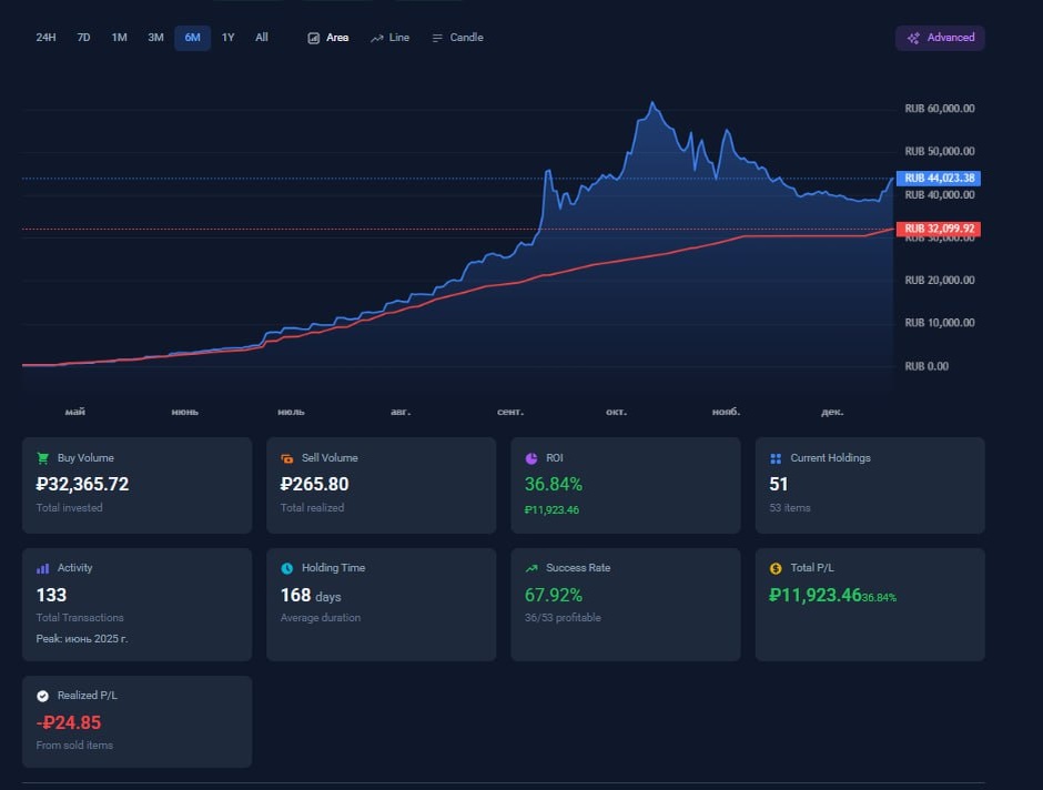 ! ➤ Кейс Разлом (10 шт.) 313.50₽ ➤ Кейс Укус змеи (10 шт.) 418.00₽ ➤ Кейс Грезы и кошмары (9 шт.) 911.52₽ 💸 ИТОГО: 1 643,02₽ Докупил Укус змеи и Разлом, так как это одни из самых бюджетных кейсов сейчас. У них большой тираж, но за счет низкой цены есть хороший потенциал для роста в процентном соотношении на дистанции (ROI). Разлом вообще один из старейших в активном пуле, многие ждут его вывода. Также взял Грезы и кошмары. Он дороже, но внутри очень востребованные скины (тот же AK-47 | Пожелание на ночь и ножи Гамма-волны), что удерживает интерес к нему на стабильном уровне. Общий портфель: Вложений на 32 365 ₽ Прибыль +11 923 ₽ Кейсы покупаю на AvanMarket