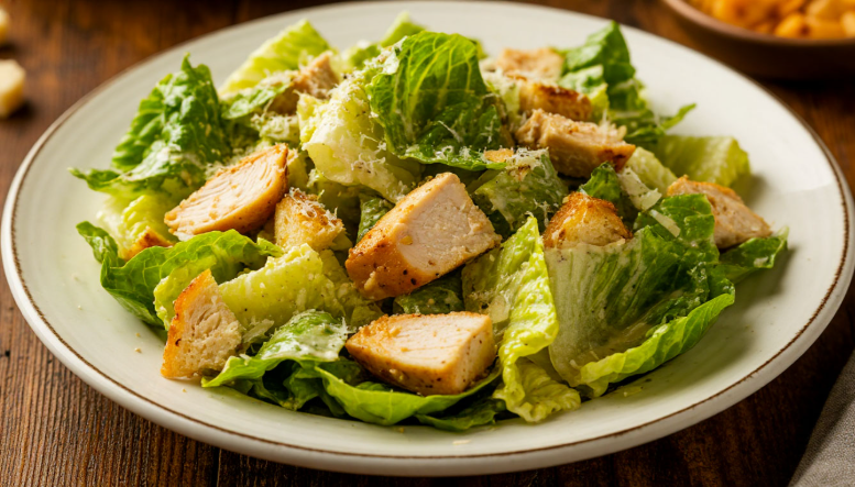 - Соберите салат в порядке: листья романо + соус + курица + сухарики + пармезан.