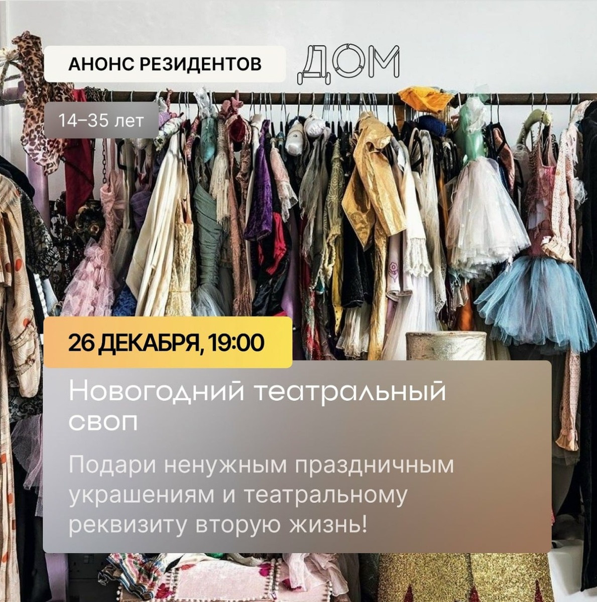 » Обмениваемся новогодними и театральными вещами и даем им вторую жизнь! Приноси и забирай: костюмы, парики, маски, аксессуары, бижутерию, гирлянды (рабочие), елочные украшения, подарочные коробки, реквизит и бутафорию. Не принимаются: стеклянные игрушки, неработающие гирлянды! ✅Важно: — не приносить повседневную одежду; — вещи должны быть чистыми; — можно ничего не приносить и взять нужное! 🗓 26 декабря | 19:00 Забирай свой билет! Создадим праздник вместе ❤️