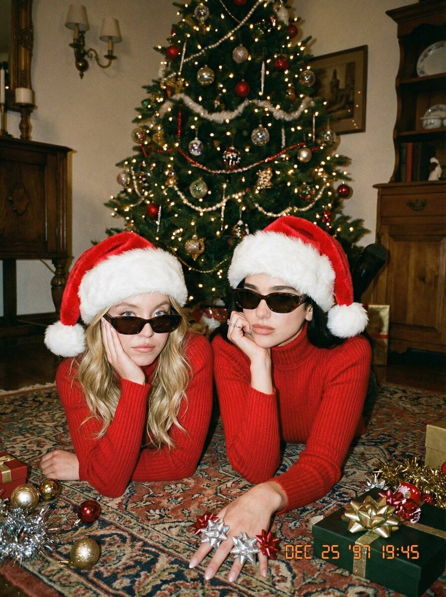 Промт: Фотореалистичная новогодняя сцена: две молодые женщины в красных трикотажных водолазках и шапках Санты лежат на полу на винтажном ковре перед большой наряженной ёлкой, опираются локтями о пол, смотрят в камеру сквозь модные солнцезащитные очки, на пальцах у них блестящие подарочные бантики, вокруг рассыпаны маленькие новогодние украшения и стоят коробки с подарками. Обе модели сохраняют расслабленную, слегка скучающе-ироничную мимику, одна опирается щекой на руку, другая свободно вытягивает руку вперёд, подчёркивая украшенные пальцы. шапки Санты ярко-красные с пышным белым меховым отворотом, свитера плотно облегают фигуру, создавая цельный красный силуэт. Освещение тёплое, домашнее, с мягкими тенями и лёгкой вспышкой, подчёркивающей фактуру кожи, трикотажа и меха; источник света направлен спереди и немного сбоку, создавая объём на лицах и мерцание на новогодних игрушках. Фон — густо украшенная ёлка с гирляндами и шарами, часть деревянного интерьера и рождественский декор, со