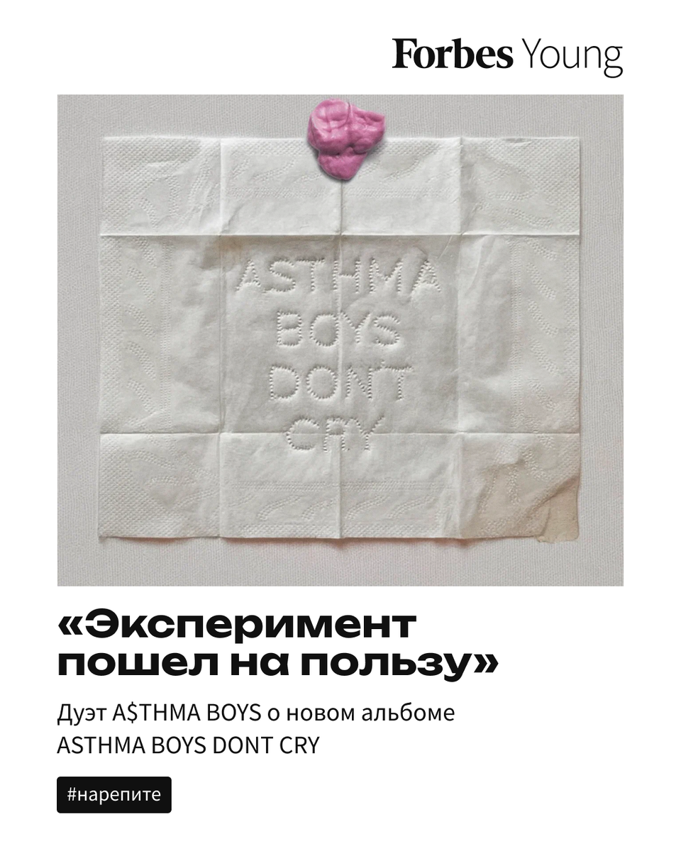 Недавно дуэт выпустил свой второй альбом ASTHMA BOYS DONT CRY, в котором продолжает экспериментировать со звуком, образами и жанрами. В основе всех композиций на пластинке музыканты оставили рэп, но создали вокруг него многослойную структуру с плотным продакшеном и эмоциональными текстами: звуковая архитектура сочетает элементы EDM, трэпа, гипер- и электропопа. В ASTHMA BOYS DONT CRY есть фиты с SALUKI и Glukoza, greyrock, SABU, Joviee и Ваней Дмитриенко.