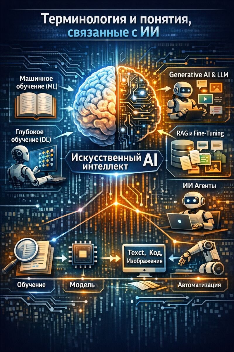 Искусственный интеллект (ИИ) - это класс систем, которые демонстрируют “интеллектуальное” поведение: анализируют информацию, находят закономерности, делают выводы и помогают принимать решения. Важно уточнение: чаще всего речь идет не о “мышлении как у человека”, а об имитации интеллектуальных функций на основе данных и алгоритмов.