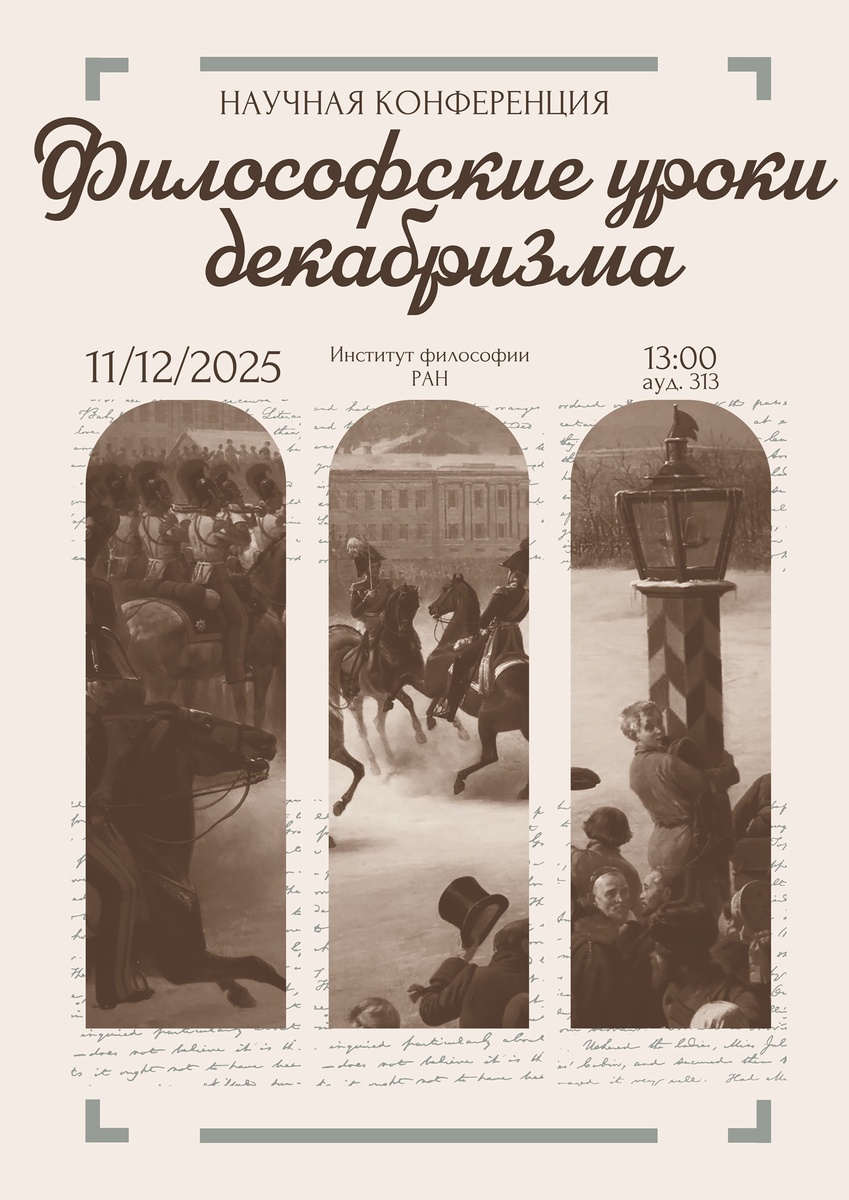 11 декабря 2025 г. состоялась научная конференция «Философские уроки декабризма», в ходе которой прошло награждение победителей конкурса философских сочинений на тему «Интеллигенция и власть в российском обществе: к 200-летию восстания декабристов». Конференция началась с торжественного награждения победителей конкурса философских сочинений на тему «Интеллигенция и власть в российском обществе: к 200-летию восстания декабристов». Первое место большое жюри решило не присуждать. Второе место завоевал Владимир Максимович Перекотин (НИУ ВШЭ), третье разделили Алексей Евгеньевич Анисимов (МГУ им. М.В. Ломоносова) и Алексей Дмитриевич Груздев (Институт философии СПбГУ). Победителям были вручены памятные призы с символикой Института, а также книги по истории России. Научная конференция открылась докладом доктора философских наук, профессора Ольги Анатольевны Жуковой (Институт философии РАН, НИУ ВШЭ) «Восстание декабристов и его этические следствия (общественный идеал и моральная ответственнос