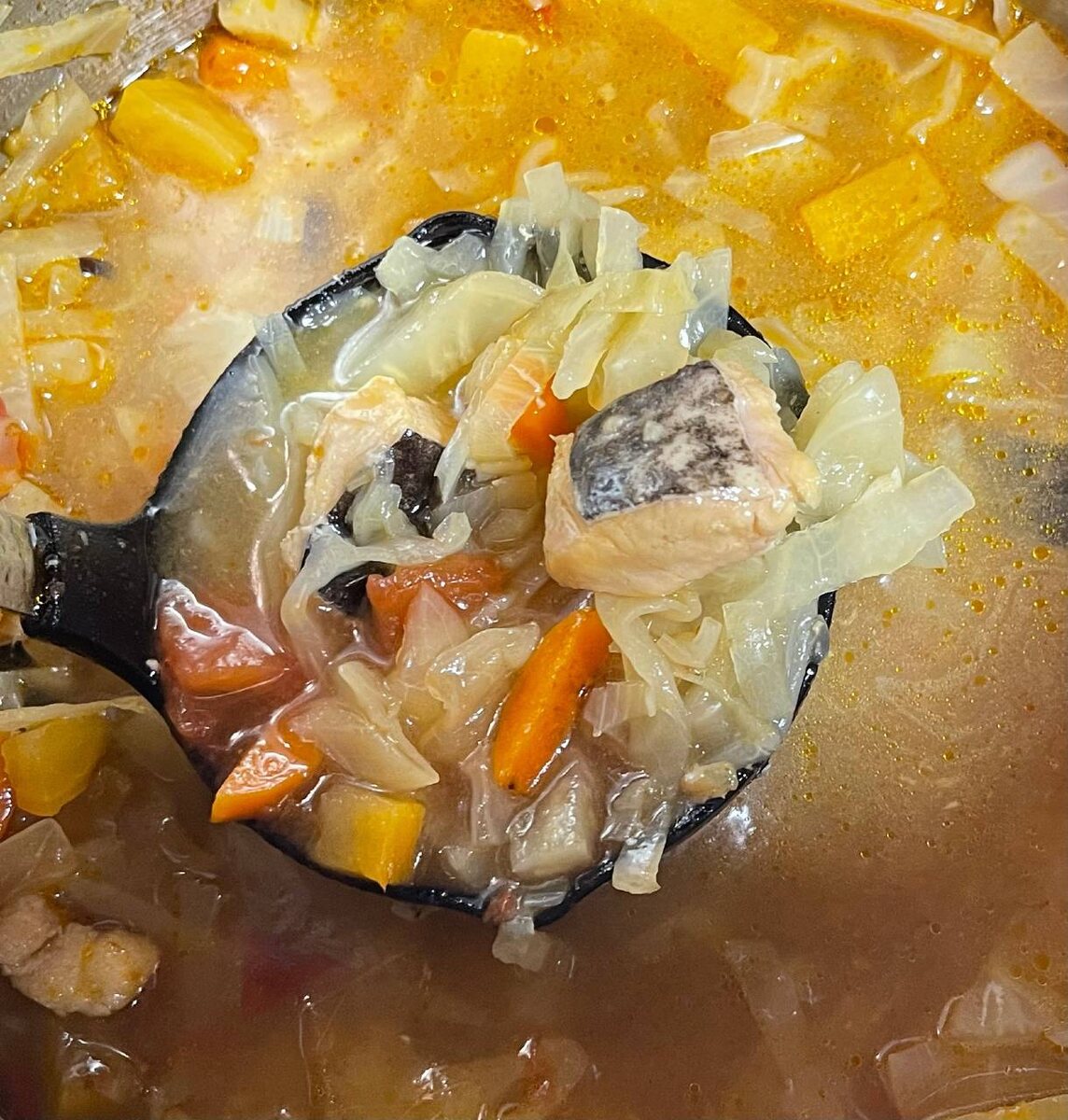 Прибывание, там, пришлось на Петровский пост. Следует отметить, что работники кухни очень неплохо кормили, как пациентов, так и персонал больницы. Вот тогда то я и попробовал Щи из Сома. Кому, до сих пор, не довелось - срочно исправляйте ситуацию! Щи из Сома Выполнены по традиции Русской Кухни 19 века, за исключением, свежей капусты и томатов. Но это дань тем, Волжским Щам. 1️⃣ Сом - 1 - 1,5 кг. 2️⃣ Сельдерей - 1 корень - 300 гр 3️⃣ Репа - 1 шт - 200 гр 4️⃣ Капуста - 1/4 кочана - 300 гр 5️⃣ Лук репчатый - 2 средние луковицы 6️⃣ Морковь - 2 шт средние 7️⃣ Помидор - большой - 200 гр 8️⃣ Зелень лука порея - 1 шт 9️⃣ Стебли укропа - от одного пучка 🔟 Лавровый лист - 2 шт Соль/Перец 1️⃣1️⃣ Корень петрушки - 1 небольшой 1️⃣2️⃣ Мука - 1 ст.л с горкой Приготовление: 1. Для начала приготовим жёлтый бульон из кореньев. Для этой цели прекрасно подойдут обрезки репы и сельдерея. Лук, белую часть порея и морковь режем пополам. Всё обжариваем на сухой сковороде. Из зелени собираем букет, обвяза