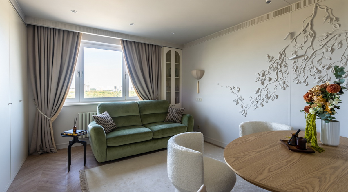- Лепной декор и барельеф: барельеф с ветвями яблони стал центральным декоративным элементом. Элегантный, не пафосный элемент, создающий акцент в нейтральном интерьере: за круглым столом собирается семья, и ветви «обрамляют» это действие.