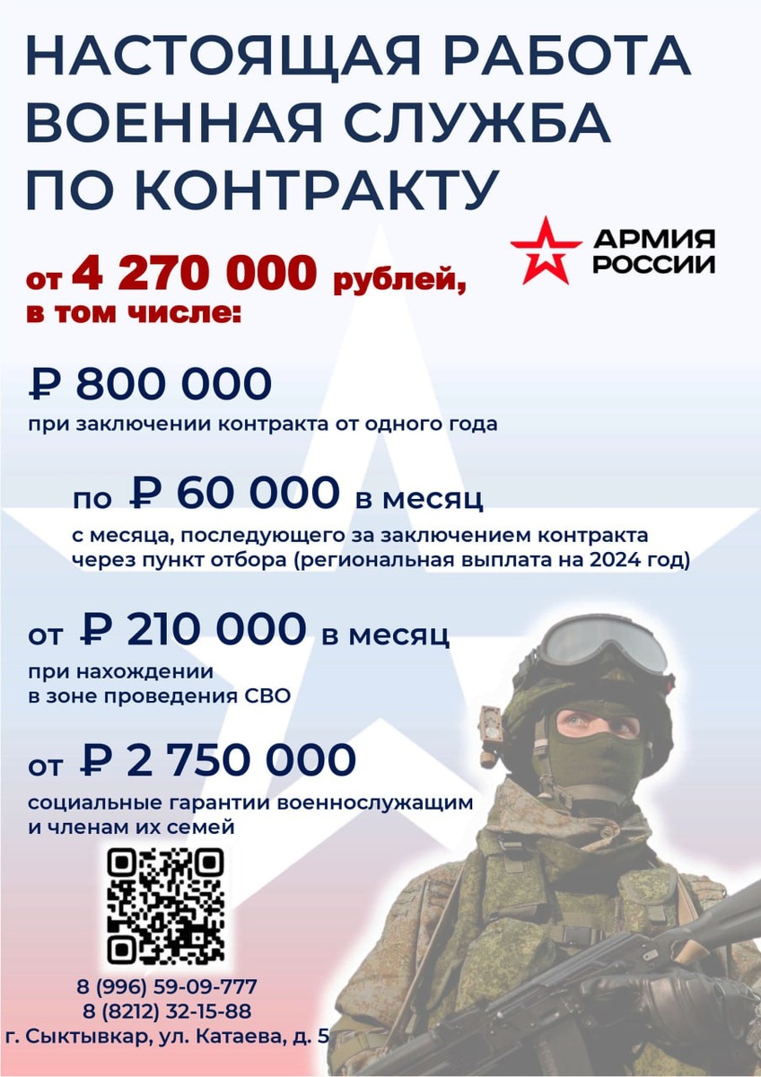 Всем мужчинам полагаются выплаты от 4 миллионов 270 тысяч рублей, различные социальные льготы и гарантии. Стать военнослужащим могут все желающие от 18 до 65 лет любых специальностей. Сегодня особенно нужны операторы беспилотников. Основные требования – годность по состоянию здоровья и отсутствие судимости. Обучение за счет государства. При отправке в зону спецоперации, военнослужащий получает 11 беспилотников. Вся подробная информация по телефону горячей линии – 32-15-88. Также можно обратиться в военные комиссариаты по месту жительства или в сыктывкарский пункт отбора по адресу улица Катаева, дом 5. ⭐️Подпишитесь на Юрган 📱Юрган в MAX