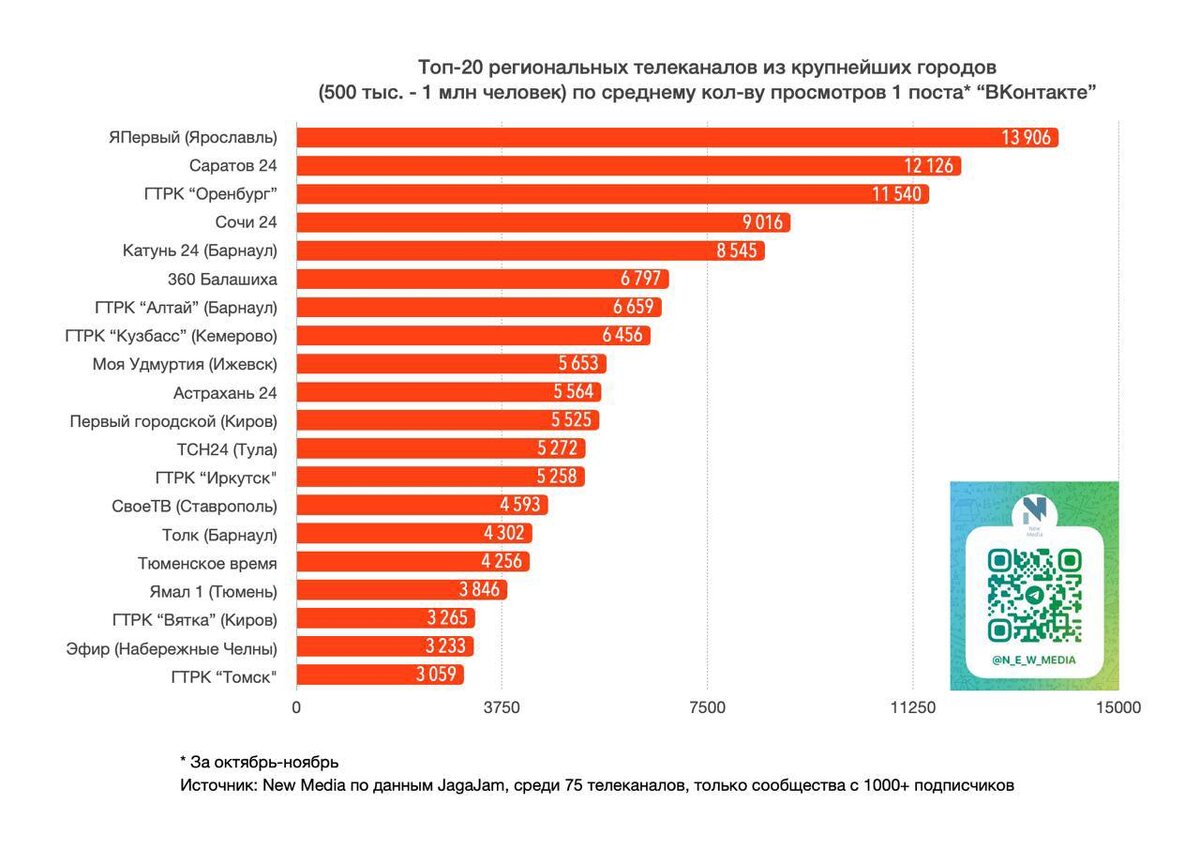 ! Наша группа во «ВКонтакте» заняла верхнюю строчку рейтинга по среднему количеству просмотров одного поста среди региональных телеканалов из крупнейших городов. Кроме того, мы попали в топ ещё по двум ведущим показателям – общему количеству просмотров и просмотровой вовлеченности. Всё благодаря нашим зрителям и подписчикам! Спасибо, что поддерживаете и остаетесь с нами! ❤️ 📸: New Media 💚 Подписаться на «Тelegram» | Подписаться на канал в «МАХ»
