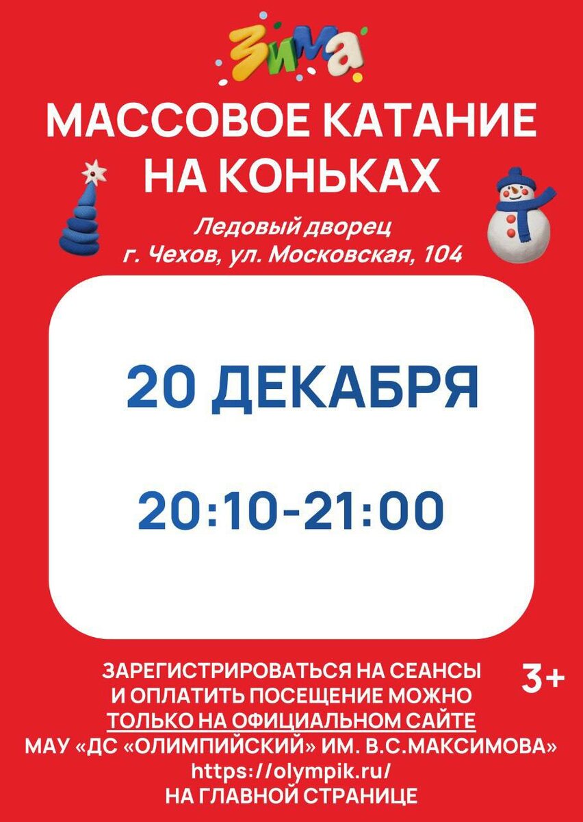 ✨ МАССОВОЕ КАТАНИЕ В ЛЕДОВОМ ДВОРЦЕ 🗓️ 20 декабря Сеанс: 20:10 - 21:00 🎵 К вашим услугам качественный лед, хорошая музыка, прокат и заточка коньков. ℹ️ Размеры коньков: с 27 по 46. 💵 Стоимость проката: детские 200 руб., взрослые 300 руб. 🚫 Возраст: 3+ 📆 20.12.2025 🏢 Ледовый дворец спорта «Витязь» 📍 г. Чехов, ул. Московская, д.104 🔗 Купить билет: https://clck.ru/3NsBk2 ⭐Поддержать канал голосом ✅ Мероприятия Чехов https://dzen.ru/id/66cc4b48e9ef144699238a51 http://vk.com/chekhov_events http://dzen.ru/chekhov_events
