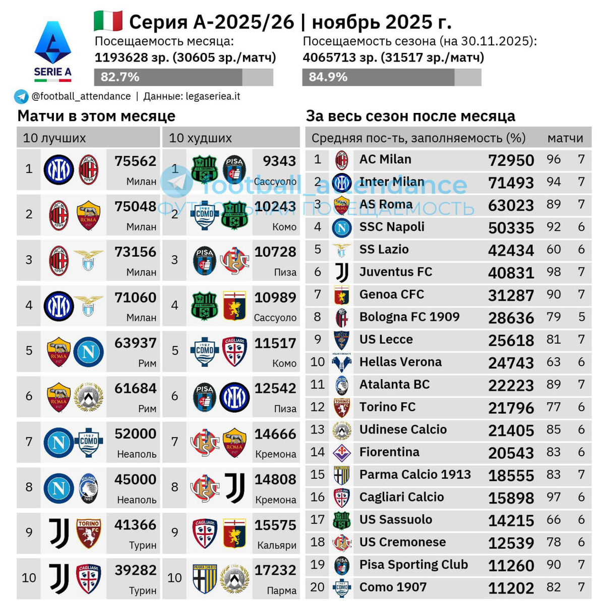 Аудитория матчей прошедшего месяца (30605 зр./матч) была на 3% меньше, чем средняя в сезоне. Посещаемость месяца Посещаемость матчей Заполняемость стадионов