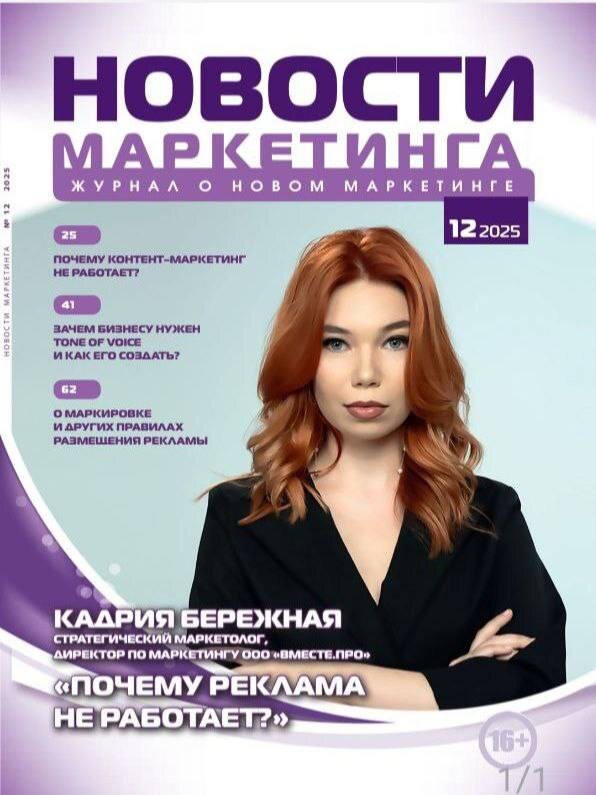 В декабрьском выпуске журнала «Новости маркетинга» вышла статья Кадрии Бережной - директора по маркетингу консалтинговой компании Вместе.ПРО - которая стала темой номера 🎉 📍Полную версию статьи можно прочить в журнале «Новости маркетинга» - https://marketingnews.ru/