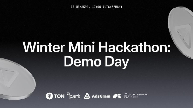 ! Уже совсем скоро подводим итоги Winter Mini Hackathon, который прошёл при поддержке партнёров: IT Park Kazan, Криптополигон, AdsGram и Cointelegraph CIS — и слушаем питчи проектов, которые команды собирали последние 2 недели. Это финальная точка хакатона: 3 минуты на презентацию + 2 минуты на вопросы и фидбек от экспертов — чтобы понять, что докрутить в продукте дальше и куда расти. Эксперты Demo Day: ▪️Анастасия Югова — TON CIS Hub Lead ▪️Михаил — Head of BD Cointelegraph CIS ▪️Елизавета Быданова — Senior Business Development Manager, AdsGram ▪️Вадим Стерлин — Co-founder AdsGram ▪️Султан Абзалов — Product Owner в Upscale / Storm Trade ▪️Игорь Заплетнев — Founder CapsGame Встречаемся в 17:00 (UTC+3/МСК) в Telegram, VK, X, а также на YouTube или Twitch. Новости | Чат | Форум билдеров | YouTube | Teletype | Twitter | VK | Twitch
