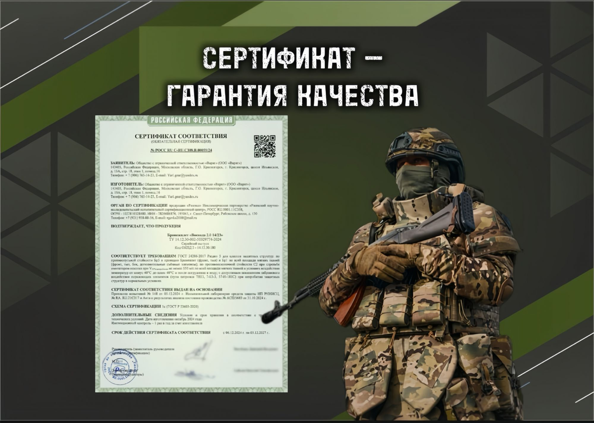 В условиях Специальной Военной Операции (СВО) на передовой линии надежность экипировки становится вопросом жизни и смерти. Сертификат — это официальный документ, гарантирующий качество продукта от производителя, и для бронеодежды, используемой в СВО, он обязателен. Если вы ищете сертифицированную бронезащиту, которая прошла строгие испытания и соответствует ГОСТ, комплекты «Воевода 14/23» от компании «Варяг» — оптимальный выбор для участников СВО. Как официальный дилер, военный магазин "Экипировка Эксперт" предлагает только проверенную продукцию, обеспечивая максимальную безопасность бойцам на фронте. Обязательная сертификация требует строгого соответствия государственным стандартам качества (ГОСТ). Для бронеодежды, от которой зависит жизнь военнослужащих в условиях СВО, такая сертификация — это не формальность, а законодательное требование. В боевых действиях СВО, где угрозы от осколков, пуль и взрывов постоянны, использование несертифицированной защиты может привести к трагическим по