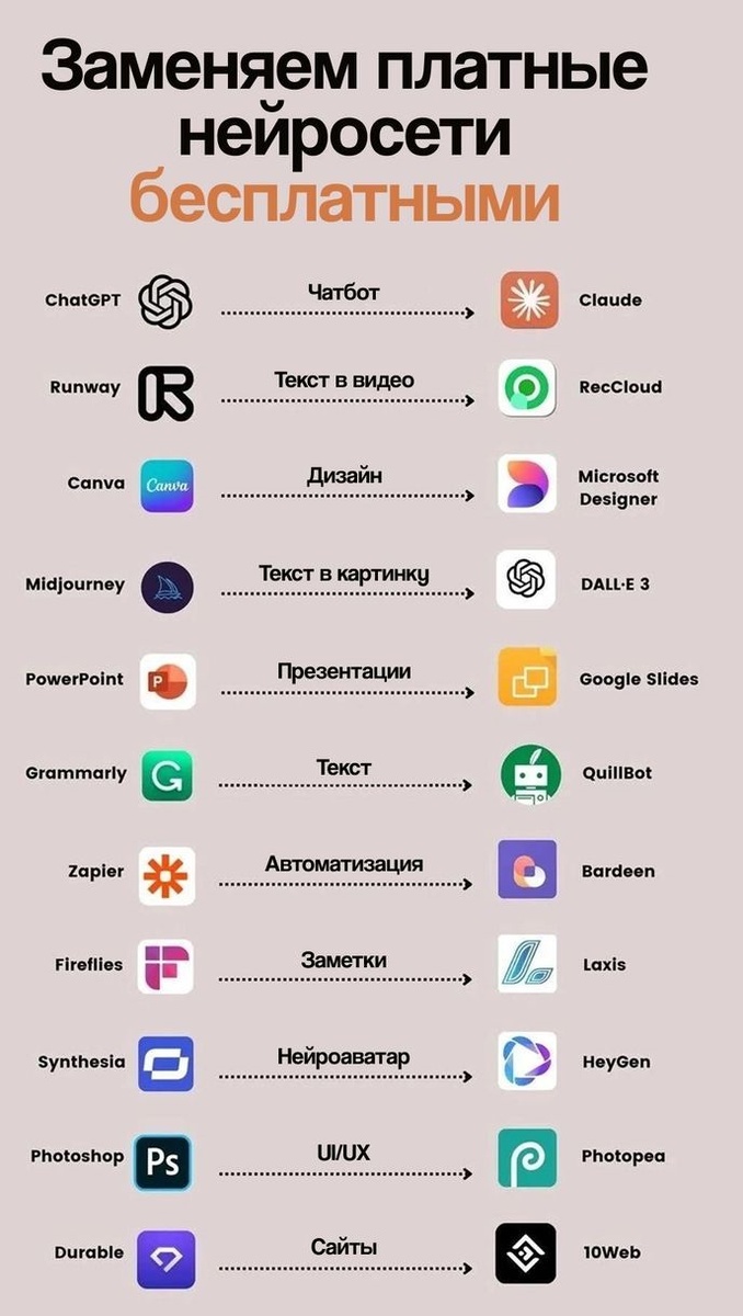 Заменяем платные нейросети бесплатными — и получаем результат лучше, чем у конкурентов Вы всё ещё платите за ChatGPT, Midjourney или Canva, когда можно использовать бесплатные аналоги — и получить даже лучший результат? Многие тратят деньги на инструменты, не зная, что есть достойные бесплатные замены. Почему это важно Какие нейросети можно заменить Продолжение здесь https://t.me/lifecidvishes/3030