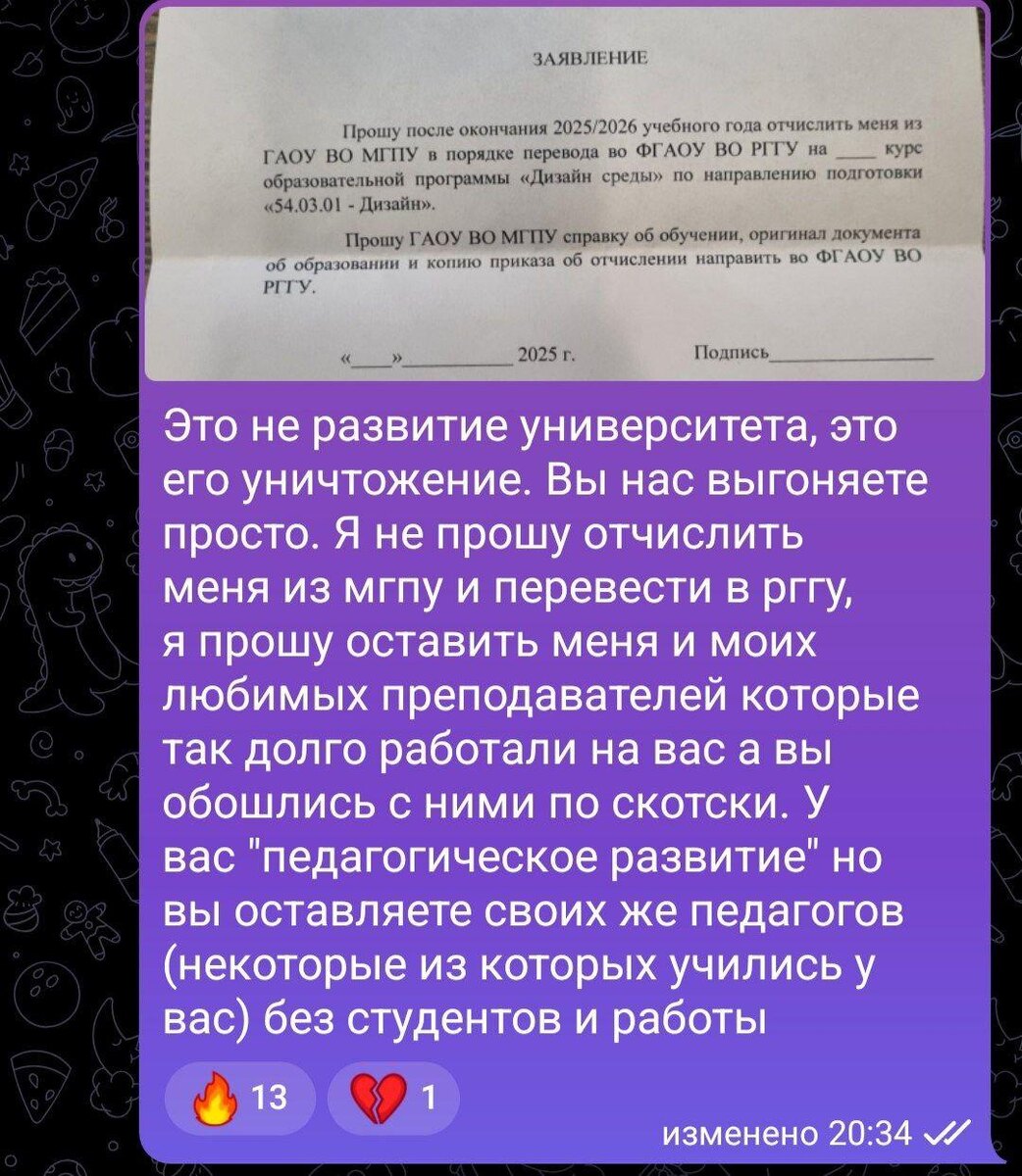 общественностью» и «Дизайн» Студентов переведут целыми группами в профильные вузы — без вступительных экзаменов. Обучение продолжится по тем же программам, с сохранением условий и стоимости; если в вузе-партнере она окажется выше, разницу компенсируют власти Москвы. При этом студенты в комментариях к посту университета выражают недовольство: многие считают, что им не дали возможности доучиться в МГПУ. «Прошу после окончания 2025/2026 учебного года отчислить меня из ГАОУ ВО МГПУ в порядке перевода», — говорится в заявлении, которое должны подписать обучающиеся. https://bg.ru/bg/city/city-news/30816-mgpu-narrow ❤️ «Большой Город»