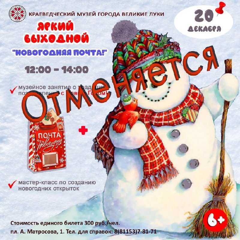 📅 Краеведческий музей Великих Лук отменил мероприятие «Яркий выходной», запланированное на 20 декабря с 12:00 до 14:00. ⚠️ Причиной отмены стали меры по соблюдению санитарно-гигиенического благополучия. 🎉 Музей приносит извинения и приглашает посетителей на семейные забавы в каникулы. 👉Подписывайтесь на ВЛуки.ру
