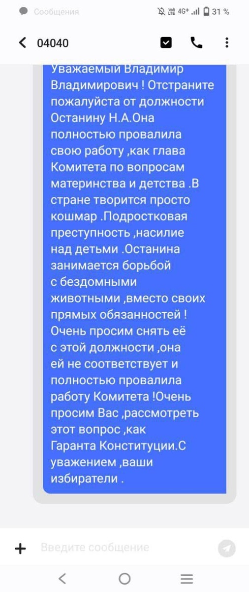 : Ребят , остались считанные дни . Пишем президенту.🙏🙏🙏🙏🙏 Количество сообщений неограниченное. Мы в шаге от залития кровью животных всей России Отправляем на 04040 . Приблизительные вопросы на фото ✅Все продолжаем отправлять обращения Президенту. ⏩Инструкция здесь : https://t.me/vserosnarodzooza/8322 ⏩Примеры обращений можно найти по хэштегу : #ПрямаяЛинияПутин Новые примеры обращений : 🐾Владимир Владимирович! Вы уделяете большое внимание духовному развитию страны! Сейчас группа депутатов (Останина, Валуев и т.д.) и чиновники из Минприроды (Е.Марков) пытаются изменить гуманную основу закона Об ответственном обращении с животными. Который был внесен в ГосДуму еще в 2010 году, долгие годы лежал без рассмотрения и наконец- то был доработан по Вашему поручению и принят в 2018 г. Пытаются изменить закон, принятие которого граждане нашей страны ждали многие годы. Закон, который полностью отвечает запросу общества на гуманное и ответственное обращение с животными, сформи
