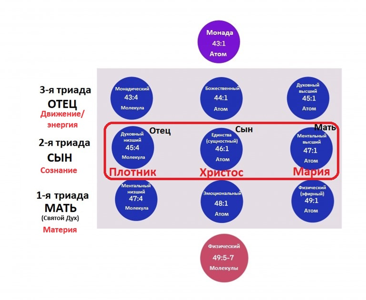 Эта концепция передавалась человечеству через различные системы мышления, но все они сосредоточены на одной теме. Эта тема вам уже знакома – тема Троицы. В гилозоике эта Троица начинается со Святой Троицы: Материи, Движения и Сознания. Она также представлена в триадной структуре развития с её тремя уровнями. Давайте пересмотрим их и поразмышляем над тем, что они проявляют.
