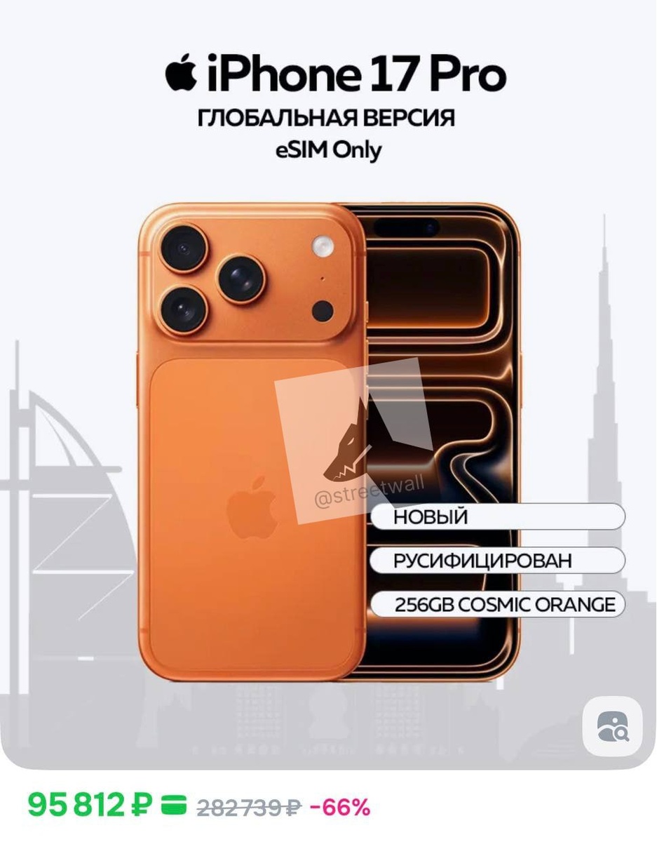 Текст: iPhone 17 Pro теперь стоит 95 тысяч рублей, в то время как изначально его цена была 165 тысяч. ────────── ⚡️Важные новости – без лишнего шума!⚡️ Подпишись на канал и получай только суть: оперативно, чётко, по делу! 👉 ИнфоСплетник | @infospletnik