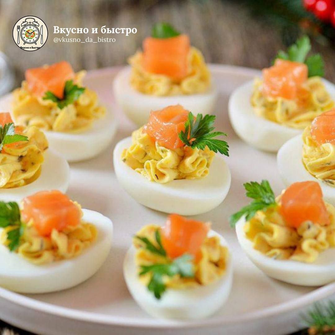 #закуска #новый_год #20мин 🕒Время приготовления: 20 минут Порций: 5–6 Калорийность: ~150–180 ккал/порция Сложность: лёгкая 🧾 Ингредиенты: 🟠Яйца — 10 шт. 🟠Семга — 100 г 🟠Майонез — по вкусу 🟠Петрушка — по вкусу 🟠Соль, перец — по вкусу 🍴Приготовление: 1. Яйца отварите вкрутую 10 минут, остудите, очистите, разрежьте пополам и отделите белки от желтков. 2. Желтки натрите на мелкой тёрке и смешайте с солью, перцем и майонезом. Рыбу нарежьте небольшими кусочками. 3. Наполните половинки белков подготовленной начинкой с помощью ложки или кондитерского мешка. 4. Сверху украсьте кусочками рыбы и свежей петрушкой. Вкусно и Быстро | Мы в Мах