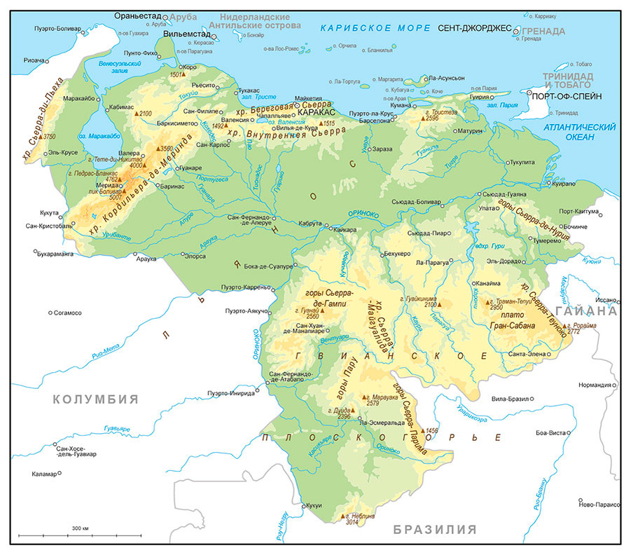 - Гвианское нагорье: Древнее плато на юге, покрытое джунглями. Здесь возвышаются знаменитые столовые горы (тепуи), ставшие прообразом "Затерянного мира". С одной из них, Ауянтепуи, низвергается водопад Анхель — самый высокий в мире (979 метров).