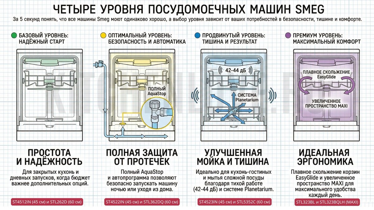 Чтобы выбрать встраиваемую посудомоечную машину Smeg, важно сразу понять один момент. Все модели Smeg моют посуду качественно. Разница между ними не в чистоте, а в удобстве использования, уровне шума, безопасности и том, насколько техника подстраивается под повседневные сценарии. Если смотреть на выбор практично, то задача не в том, чтобы купить самую дорогую модель, а в том, чтобы не переплатить за функции, которыми вы не будете пользоваться. Если кухня позволяет, почти всегда разумнее выбирать посудомоечную машину шириной 60 см. Полноразмерная модель вмещает больше посуды, реже требует запуска и проще загружается. В нее легче поставить кастрюли, сковороды и формы для запекания без перестановки корзин. Модели шириной 45 см - это всегда компромисс. Их выбирают тогда, когда физически нет места для полноразмерной техники. Узкая машина быстрее заполняется и требует более аккуратной загрузки, особенно если вы часто готовите дома. Базовый уровень в линейке Smeg - это простая и понятная тех