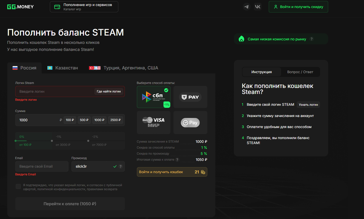 Сервис GG.MONEY позволяет быстро и удобно пополнить баланс Steam в несколько кликов: указываете логин аккаунта, выбираете сумму и оплачиваете удобным способом — и деньги зачисляются на ваш кошелек Steam. ➡️ Главное преимущество — низкая комиссия, которая может стать ещё ниже при использовании промокода SLICK3R (скидка ~6 %). Это делает GG.MONEY выгодным вариантом пополнения, особенно если вы часто докупаете валюту для игр или приобретаете игры на Steam по сниженной стоимости.