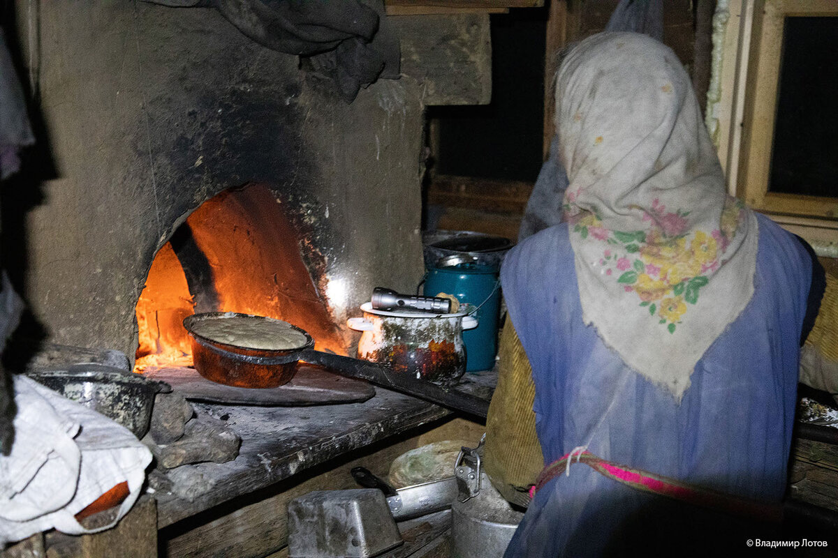 Пока тесто подходит, жизнь на заимке идёт своим чередом. Нужно накормить коз ветками талины или сеном, дать курам толчёной картошки с отсевами муки, следить, чтобы дикий зверь — медведь или волк — не подобрался к хозяйству. Агафья делает всё это одна, крохотная женщина ростом меньше полутора метров, обладающая невероятной силой духа. Потом приходит время топить большую русскую печь. Она выгребает золу, закладывает дрова, ждёт, когда пламя как следует прогорит, а жар равномерно прогреет глиняный свод. Только опытный глаз может определить тот самый момент, когда температура идеальна для выпечки. Угли сгребаются в специальный загнет, и на чистый под ставится чугунок или форма с тестом. Дверца закрывается, и хлеб остаётся наедине с жаром на час двадцать минут. Что делает в это время Агафья? Она не смотрит на часы. Она снова молится, читает псалтырь, каноны, вспоминает умерших родных.