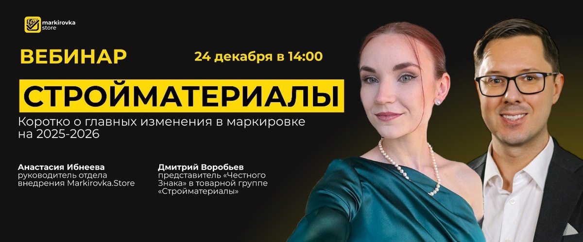 ! На следующей неделе мы вместе с ЦРПТ и «Честным Знаком» приглашаем вас на вебинар: «Стройматериалы — новые правила маркировки 2025–2026» ➡️ Что вы получите: • Чёткое понимание обязательных сроков и этапов маркировки стройматериалов • Практические инструменты для автоматизации через Markirovka.Store • Советы экспертов по избежанию штрафов и сбоев в бизнесе 🔊 Спикеры: • Дмитрий Воробьев, представитель «Честного Знака» в товарной группе «Стройматериалы» • Анастасия Ибнеева, руководитель отдела внедрения Markirovka.Store 🖇️ Дата: среда, 24 декабря 2025 Время: 14:00 (МСК) Регистрация Подготовьтесь к новым требованиям заранее и сохраните время и ресурсы компании!