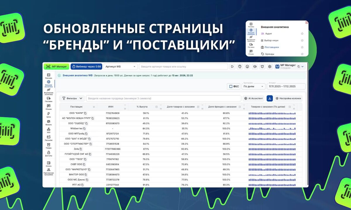 » В разделе внешней аналитики вышло важное обновление: мы полностью переработали отчёты «Поставщики» и «Бренды». Теперь они работают по логике отчёта «Выбор ниши» и показывают полную картину рынка, а не выборочные данные. Что изменилось: – отображаются все поставщики и бренды на маркетплейсе; – удобные списки для быстрого анализа; – единый подход к исследованию ниши, конкурентов и рынка в целом. 💡 Что это даёт селлеру: • Понимание своего места на рынке и реального масштаба конкуренции. • Быстрый анализ своего кабинета в разрезе всех продавцов и брендов. • Удобное исследование ключевых конкурентов: ассортимент, активность, динамика. • Более взвешенные решения при запуске товаров и масштабировании. 📊 Теперь внешняя аналитика стала ещё более наглядной и полезной. 👉 Посмотреть обновлённый отчёт #Аналитика #Поставщики