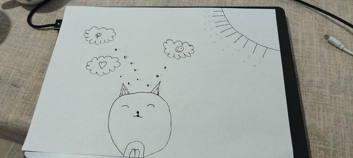 🌞🐾 Вот как можно расшифровать её рисунок: 🐱 Центральный персонаж — существо с закрытыми глазами Похоже на котика или мягкое существо, стоящее спокойно, с лёгкой улыбкой. Это может быть образ самой девочки — в состоянии мечты, покоя, внутреннего света. Закрытые глаза — знак внутреннего взора, размышления, воображения. ☁️ Три мысли в облаках Цветок — символ красоты, роста, природы. Сердце — любовь, привязанность, доброта. Улыбающееся лицо — радость, дружба, принятие. Эти три образа — как три ценности, которые живут в её голове: «Я хочу, чтобы было красиво, чтобы было добро, чтобы было весело.» 🌞 Солнце с лучами и примерами Лучи — как потоки света и знаний, а на них — таблица умножения на 1. Это может быть её способ сказать: «Я учусь. Я понимаю. Я освещаю мир простыми истинами.» Умножение на 1 — как утверждение идентичности: «Я × 1 = Я» — быть собой, не теряя себя. 🧩 Общий смысл Это рисунок о внутреннем мире ребёнка, где: Центр — спокойствие и мечта Мысли — любовь, к