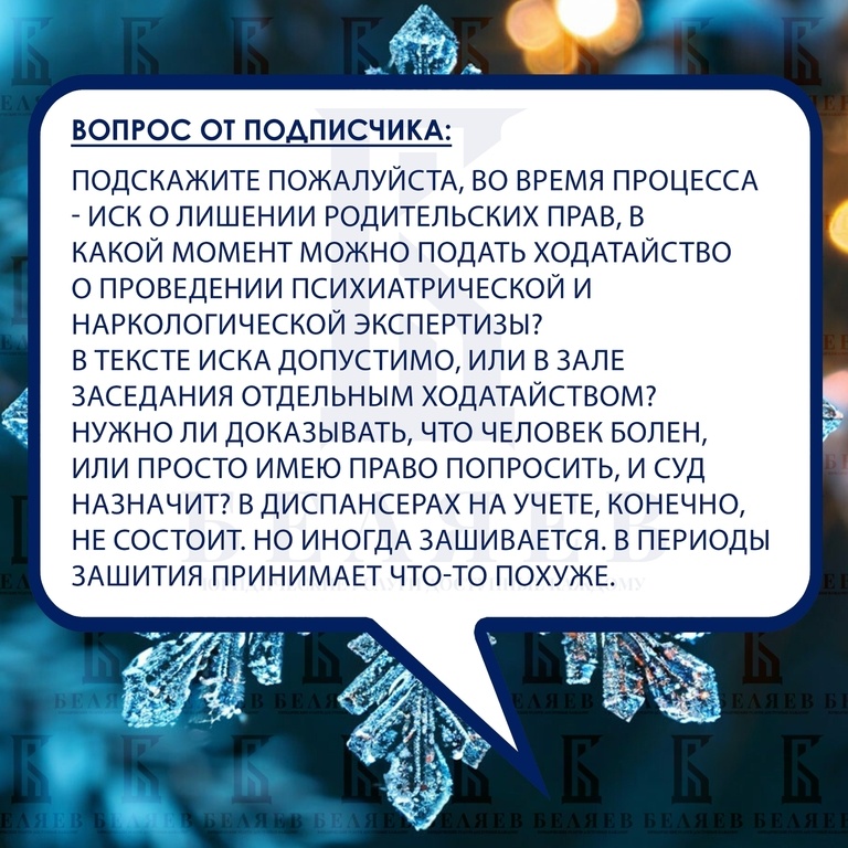 : Подскажите пожалуйста, во время процесса - иск о лишении родительских прав, в какой момент можно подать ходатайство о проведении психиатрической и наркологической экспертизы? В тексте иска допустимо, или в зале заседания отдельным ходатайством? Нужно ли доказывать, что человек болен, или просто имею право попросить, и суд назначит? В диспансерах на учете, конечно, не состоит. Но иногда зашивается. В периоды зашития принимает что-то похуже. Отвечаю: Просить экспертизу можно в любой момент процесса, лучше письменно отдельным ходатайством. Но суд не обязан её назначать «по факту просьбы» – нужно обосновать, зачем она делу, одних общих подозрений обычно мало. Основание для лишения родправ – в том числе хронический алкоголизм или наркомания родителя, подтверждённые медзаключением (ст. 69 СК РФ). Дело о лишении рассматривается судом с участием прокурора и опеки, суд обязан максимально полно выяснить обстоятельства, влияющие на ребёнка (ст. 70 СК РФ, Постановление Пленума ВС РФ от 14.11.2