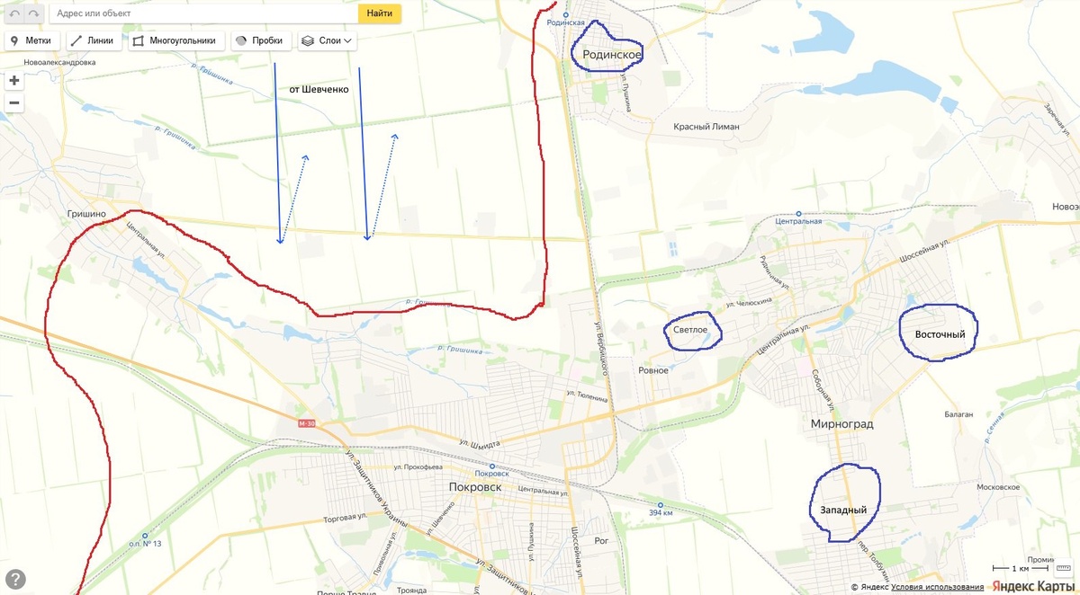 Очаги сопротивления в Мирнограде - микрорайоны Западный и Восточный и два населенных пункта на окраинах - Светлое и Родинское. Который день идут попытки по полям от Шевченко просочиться в северные окраины Красноармейска, где по версии Сырского все под контролем ВСУ.