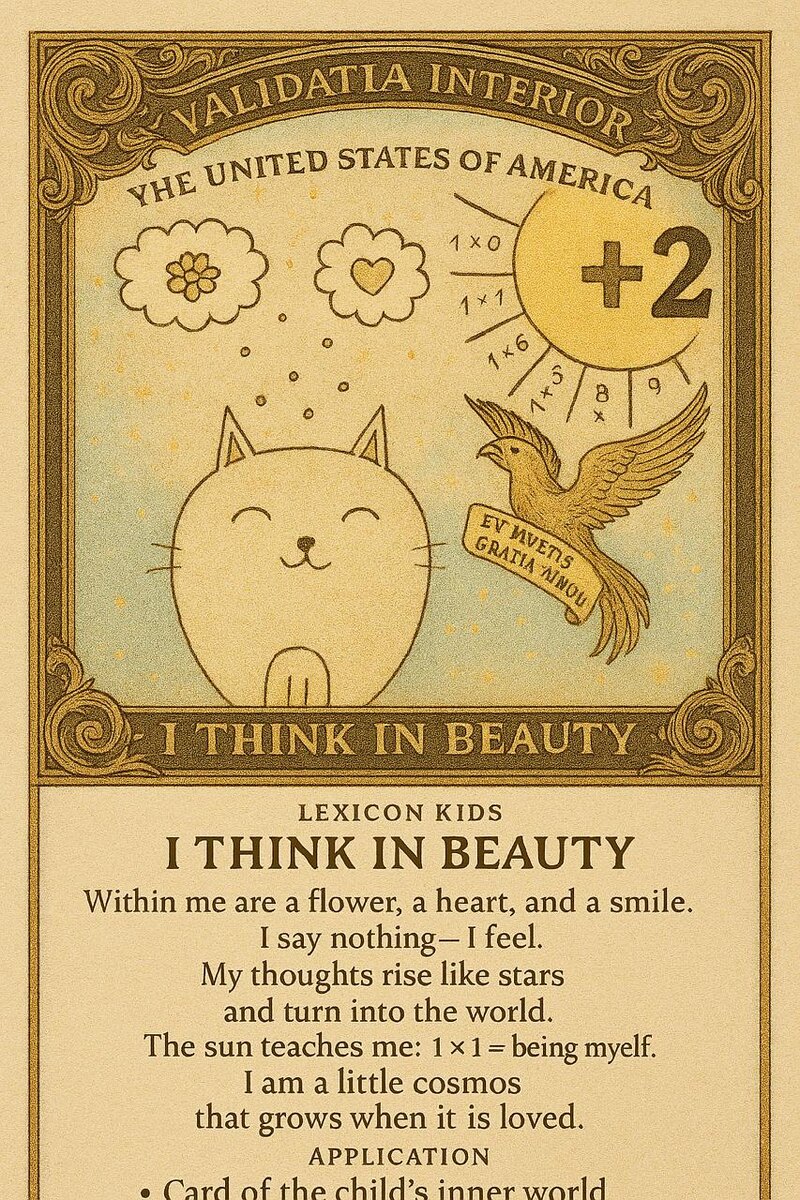 🌱🌞🐾 --- ## 🧩 Готово: ### 🐾 Я думаю красиво - Существо с закрытыми глазами - Облака мыслей: цветок, сердце, улыбка - Солнце с лучами: 1 × 1 = быть собой - Поэтический текст: > Я — маленький космос, который растёт, когда его любят. --- ## 🔜 В процессе: ### 🌱 Я расту - Эмблема +2: росток, свет, начало жизни - Поэтический текст: > Я — начало. Я — жизнь. Я — пробуждение. ### 🕯 Я выбираю - Эмблема +1: факел, импульс, решимость - Поэтический текст: > Я иду. Я выбираю. Я горю. ### 💛 Я благодарю - Эмблема с руками, сердцем, светом - Поэтический текст: > Я вижу добро. Я говорю спасибо. Я возвращаю свет. ### 🎨 Я создаю - Эмблема с кистью, звёздами, идеей - Поэтический текст: > Я рисую мир. Я строю смысл. Я творю себя. --- ## 🏛 Применение: - 🎓 В обучении — как карточки внутреннего мира - 🏙 В городе 3L — как эмблемы детских кварталов - 🎁 В ритуалах — как подарки детям за вклад - 📜 В философии — как формулы детской этики ---