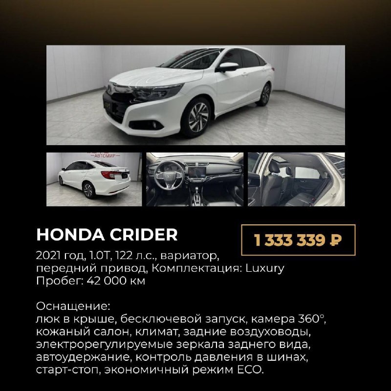 Сравню честно ✔️ Часто слышу вопрос: «А что вообще можно взять за полтора миллиона?» Показываю на реальном примере — LADA Vesta на вторичке РФ и Honda Crider под заказ. 🇷🇺 LADA Vesta, 2022 🟠 1.6 бензин, 106 л.с. 🟠 МКПП, передний привод 🟠 Пробег 22 000 км, 2 владельца 🟠 Базовый седан, без современных ассистентов 💰 Цена — 1 500 000 ₽ Плюсы: знакомая модель, простая конструкция, левый руль. Минусы: механика, слабая динамика, минимальный набор опций за эту цену. 🇨🇳 Honda Crider 180Turbo CVT Luxury Edition, 2021 🟠 Турбо-двигатель 1.0, 122 л.с. 🟠 CVT, передний привод 🟠 Пробег 42 000 км 🟠 Кузов в оригинальной краске, салон как новый 💰 1 333 339 ₽ под ключ во Владивостоке Что получаем за меньшие деньги: ✔️ автомат (CVT) ✔️ в 1,5 раза больше мощности ✔️ люк, бесключевой доступ ✔️ круговой обзор 360° ✔️ кожаный салон ✔️ системы помощи: старт-стоп, удержание, помощь при торможении и на подъёме ✔️ TPMS, ECO-режим, задние дефлекторы вентиляции 📌 Вывод За тот же бюджет Honda даё