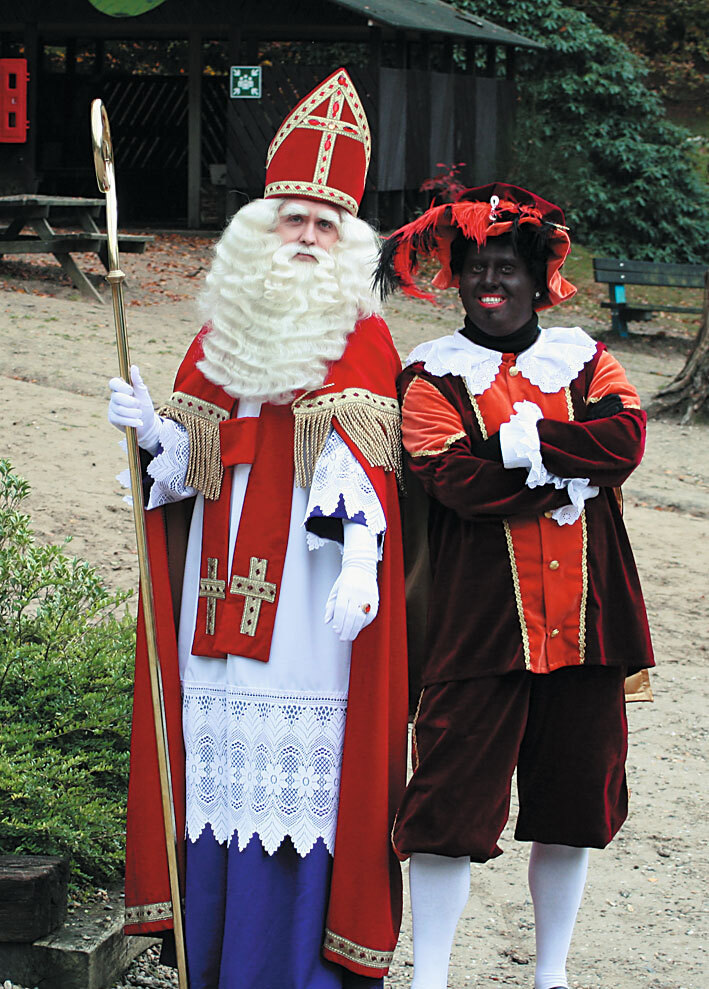 Для начала – добро пожаловать в Голландию! Кстати говоря, местные дети говорят не «Санта-Клаус», а «Синтерклаас». Однако нас в данном случае больше интересует верный помощник Синтерклааса – Зварте Пит, он же Чёрный Питер. Вы только посмотрите на портрет – шикарная «Снегурочка», правда? Во-первых, мужчина. Во-вторых – негр! Синтерклаас вместе с Зварте Питом весь год живут далеко на юге, в Испании, в глубокой пещере, а в Голландию приезжают только на Новый год и Рождество.