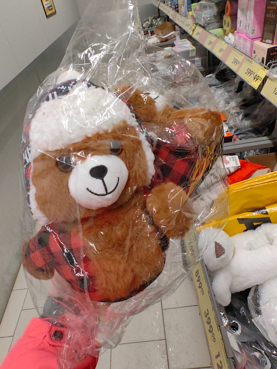 Успела сходить в магазин Чижик, присматриваю подарки из новинок. Надо же, какие мягкие мишки, в зимних шапках-ушанках. Игрушка? Вовсе нет. А для чего такая новинка? Это теплые, пушистые домашние тапочки. И для фотосессии подойдут, хорошенькие на вид. Медвежонок словно в клетчатом костюмчике, сбоку лапки, объемные. Подошва не скользит. Если не с медвежонком, тогда белоснежные пушистые котятя. Покажу поближе, милое оформление, вышивка. Ушки с блестящей вставкой. Подошва черная, не маркая. Размеры от 36 по 41, тапочки за 899р. Палантин мягкий, теплый, большой. Серо-черно-белую клетку, чуть заметны ворсинки на одежде. Полиэстер, за 399р. В небольшой коробке кофеварка, для молотого кофе, встроенный многоразовый фильтр. Кофеварка идет с керамической кружкой - 150 мл. Кофеварка электрическая, капельная. Простенькая, для дома, для подарка. Рядом коробки с наушниками, беспроводные, подходят ко многим цифровым устройствам. Салфеточки бумажные, новогодние, в упаковочках по двадцать штук.