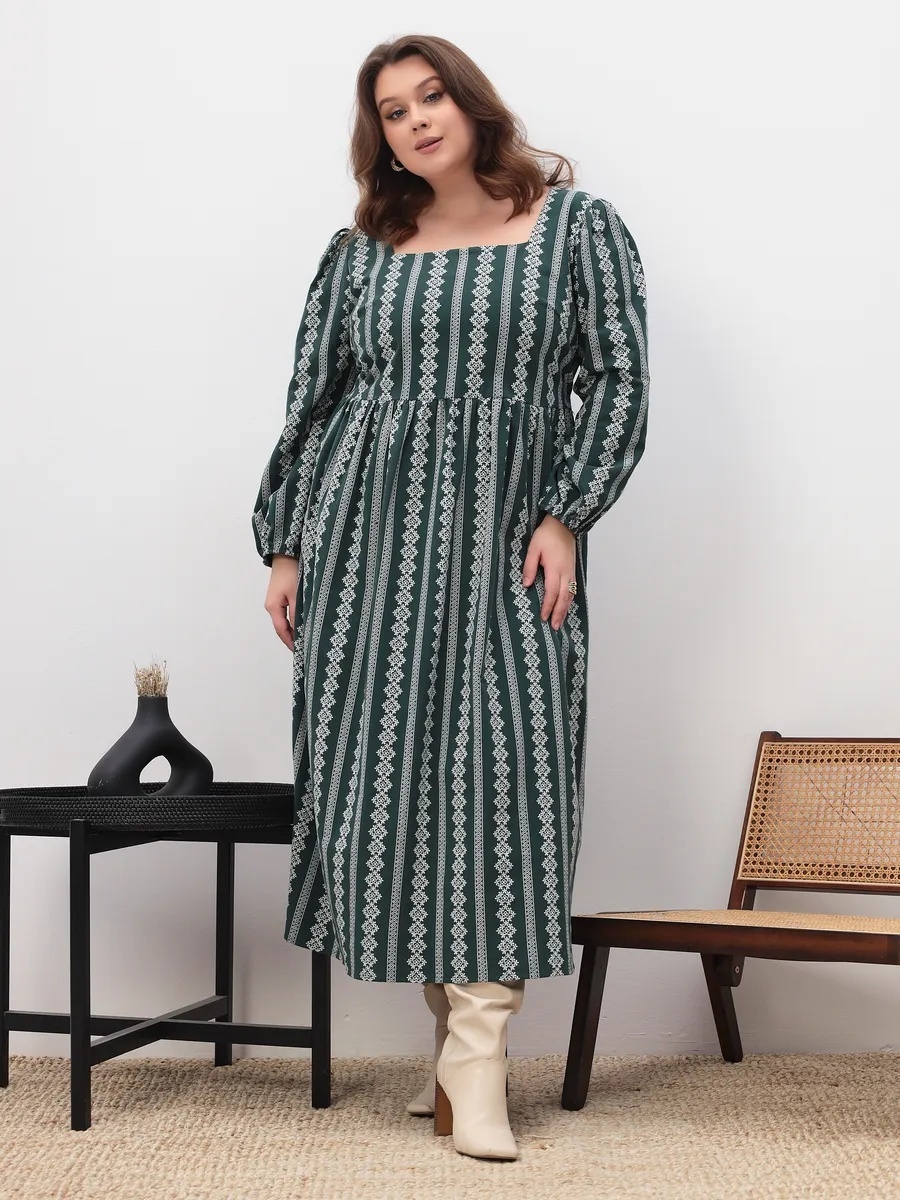 Это платье — мгновенный перенос в атмосферу уютной осенней сказки или богемного летнего фестиваля. Глубокий изумрудно-зеленый этнический принт смотрится дорого и небанально, сразу выделяя вас из толпы. Свободный силуэт миди и рукава-фонарики на резинке создают тот самый романтичный, слегка ностальгический образ, который так любят в стиле бохо.
