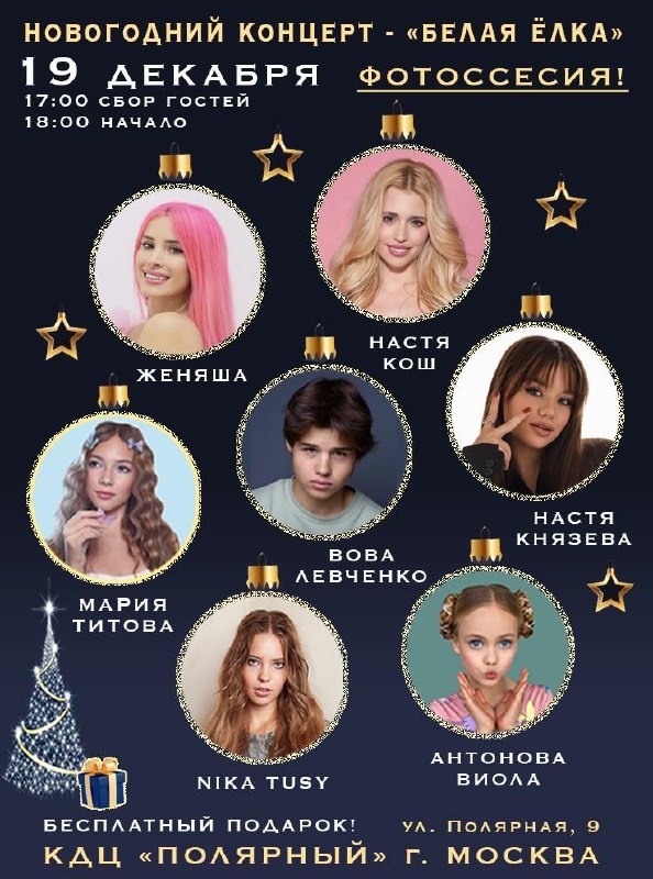! Остались последние билетики - кто ещё не успел самое время купить! Билеты по ссылке 😄😄😄 📅 19 декабря 📍 КДЦ «Полярный», Москва 🎄 Шоу «Белая Ёлка» 17:00 — сбор гостей 18:00 — начало После концерта автограф-сессия бесплатно! 😄😄😄 📸 Вас ждёт праздничная фотосессия 🤍 Белая дорожка для красивых кадров и яркого начала вечера 🎁 Каждому гостю — ПОДАРОК