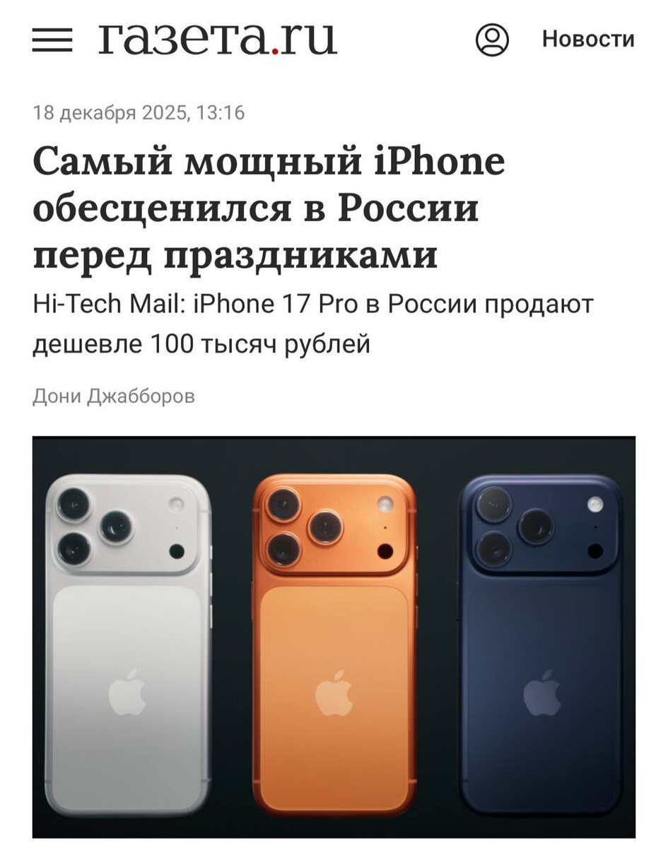 📱 До 97 тысяч рухнула цена на iPhone 17 Pro, на старте продаж он стоил — 165 000 рублей.