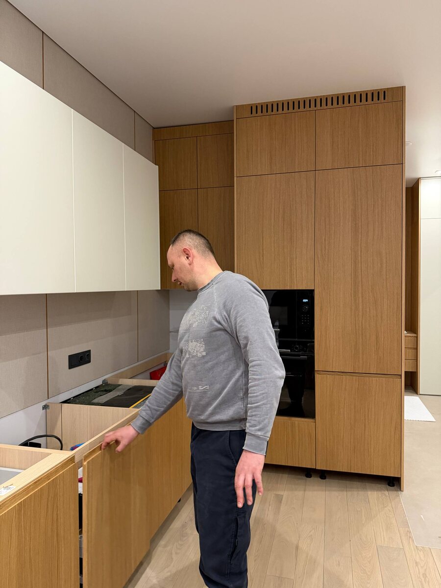 Кухня в шпоне Фурнитура Blum Здесь про: Концепцию Шпон Показываем факапы Все, как в реальной жизни мебельщика ) В этом посте есть большое видео, которое не загрузилось в Дзен. Откройте оригинал поста в телеграме, чтобы его посмотреть